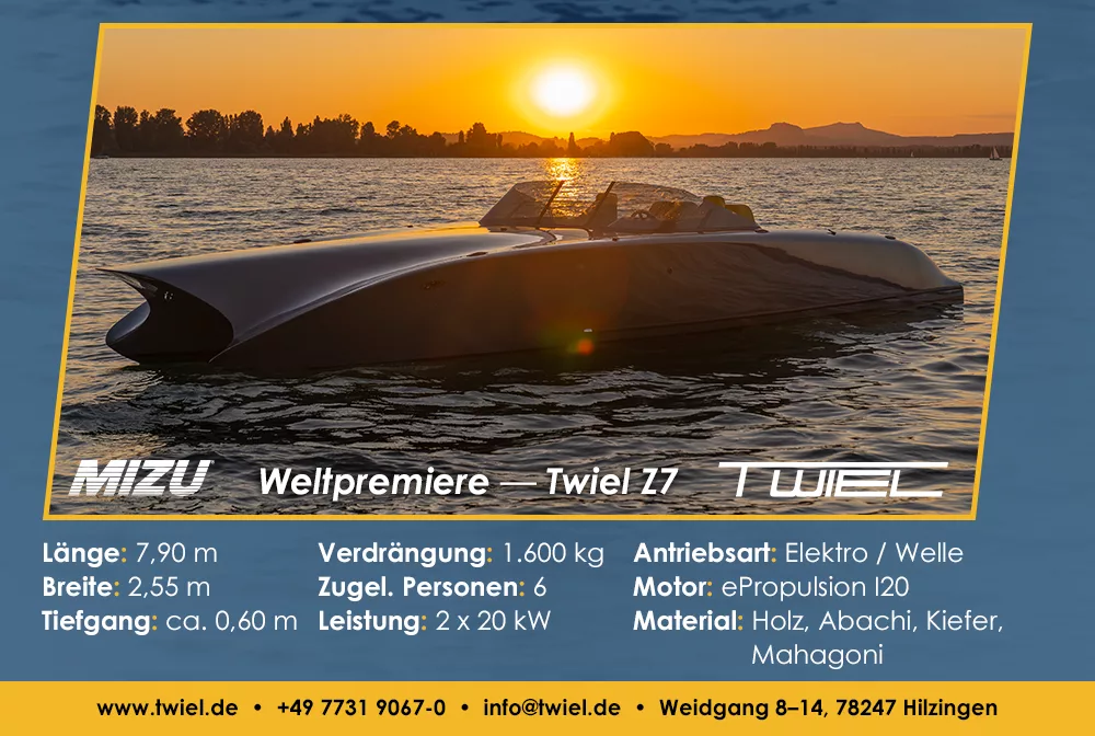 The use of state of the art architecture in combination with traditional hand work, quality, and part of regional materials and a unique Design make each Twiel to a true unique. By the form of the patented design of hull and the modern electric drive slides gently and silently in the water, what a pleasant driving experience leads.